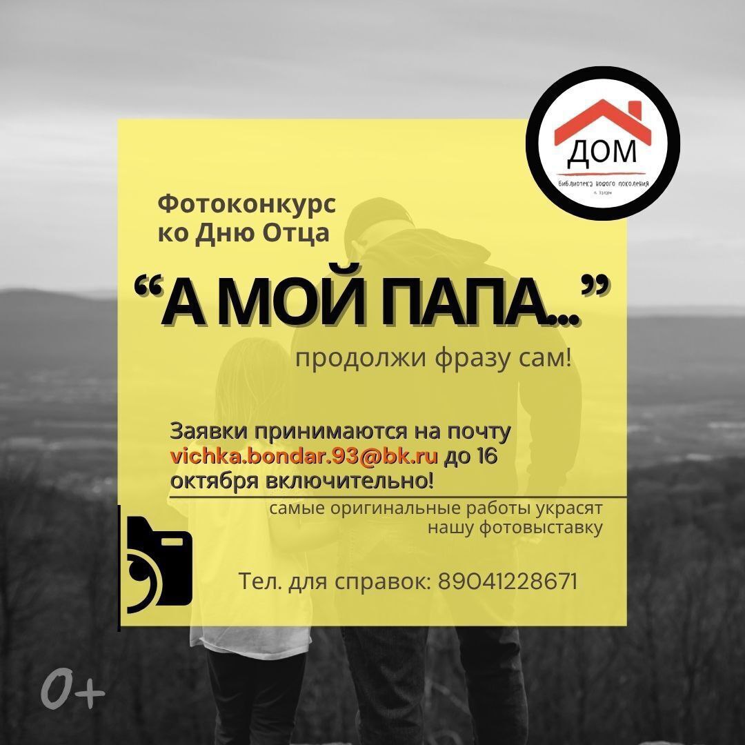 Кто может участвовать?Дети и подростки от 6 до 14 лет Сроки проведения:Приём работ: с 2 по 16 октябряПодведение итогов: 19 октября Призы:Дипломы I, II и III степениСертификаты всем участникамВыставка лучших работ в библиотеке Как участвовать:Пришлите фото папы на почту: vichka.bondar.93@bk.ruВ теме письма напишите «На конкурс»В письме укажите свои данные и подпись к фото начинающуюся со Читать далее…